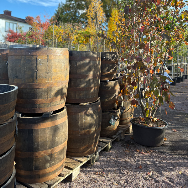 Vi har ett fint sortiment av begagnade whisky- och vinfat för plantering av säsongsväxter, perenner, buskar eller små träd. Du kan även ha vattenväxter i dem eller använda dem som behållare för regnvatten. Om du ska plantera i dem, så är det viktigt att du borrar 3-4 hål i botten så att överflödigt vatten kan rinna ut. Tänk också på att ekfaten är gjorda med äkta tunnbindningsteknik, så de får inte ställas under tak. Då kan de bli för torra och börja falla isär.